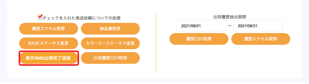 楽天RMS 楽天RMS – ステータス更新手順 「配送」>「出荷履歴・状況確認」ページを開き、ステータス変更を行う出荷を確認 該当出荷の「状態」が「発送完了」になっていることを確認 発送が完了すると、件名「本日分の配送手配完了のお知らせ」メールにて通知が届きます。 該当出荷のチェックボックスにチェックを入れます。 ページ下部にある「楽天RMS出荷完了送信」ボタンを押してください。