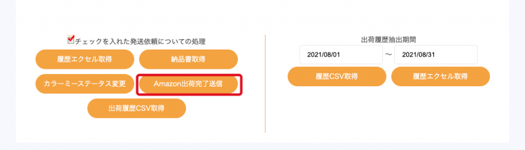 Amazon Amazon – ステータス更新手順 「配送」>「出荷履歴・状況確認」ページを開き、ステータス変更を行う出荷を確認 該当出荷の「状態」が「発送完了」になっていることを確認 発送が完了すると、件名「本日分の配送手配完了のお知らせ」メールにて通知が届きます。 チェックボックスにチェックを入れる ページ下部にある「Amazon出荷完了送信」ボタンを押してください。