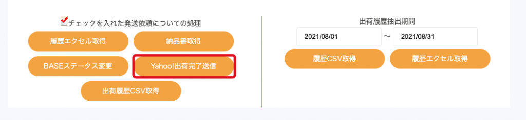 Yahoo Yahoo! – ステータス更新手順 「配送」>「出荷履歴・状況確認」ページを開き、ステータス変更を行う出荷を確認 該当出荷の「状態」が「発送完了」になっていることを確認 発送が完了すると、件名「本日分の配送手配完了のお知らせ」メールにて通知が届きます。 該当出荷のチェックボックスにチェックを入れる ページ下部にある「Yahoo!出荷完了送信」ボタンを押してください。