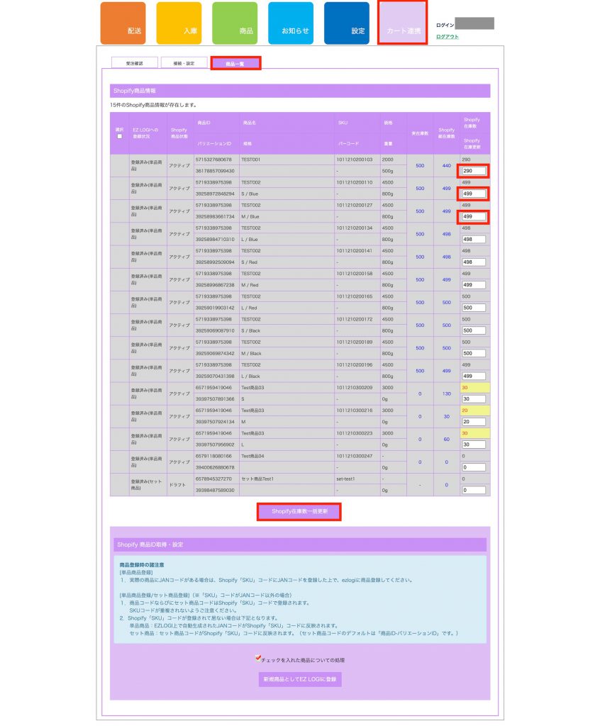 「カート連携」>「Shopify」>「商品一覧」ページで商品の在庫を更新します