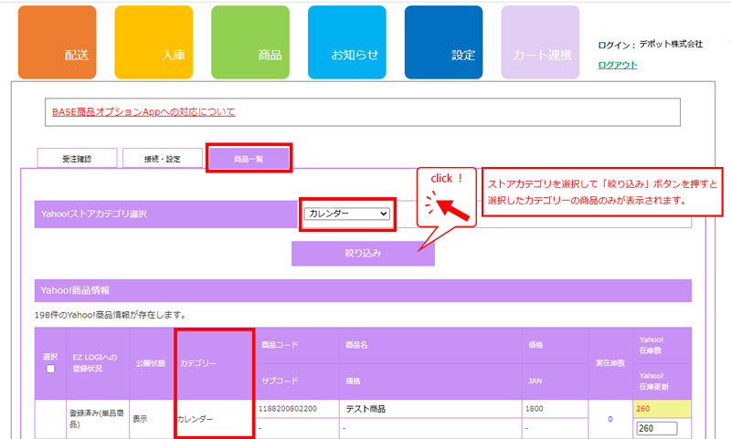 「カート」>「Yahoo」>「商品一覧」ページで商品の在庫を更新します