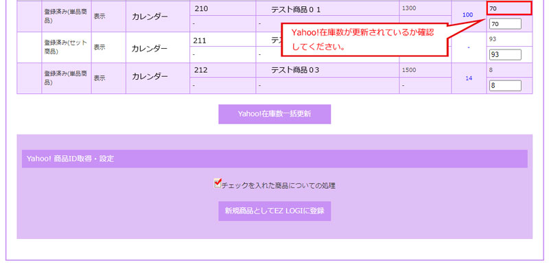 該当商品の在庫数を編集し、「Yahoo!在庫一括更新」ボタンを押してください。