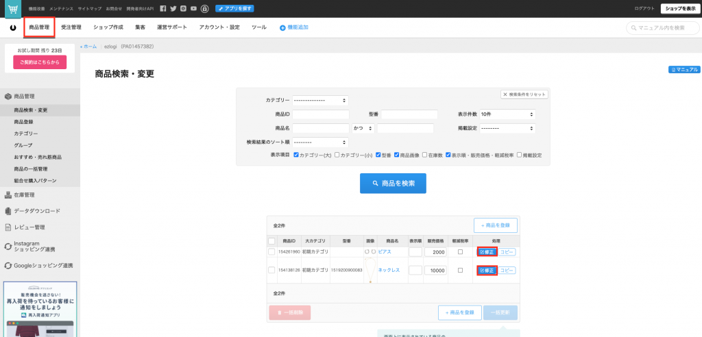 カラーミーの管理画面にログインし、「商品管理」を選択し、修正する商品の「修正」ボタンをクリック