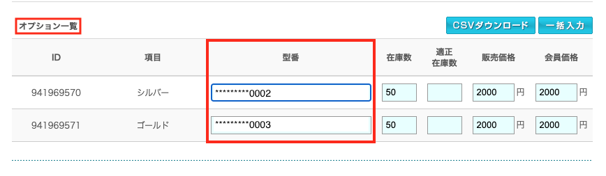 規格が存在する場合は、下部にある「オプション情報」を表示し、オプション一覧にある「型番」に入力します