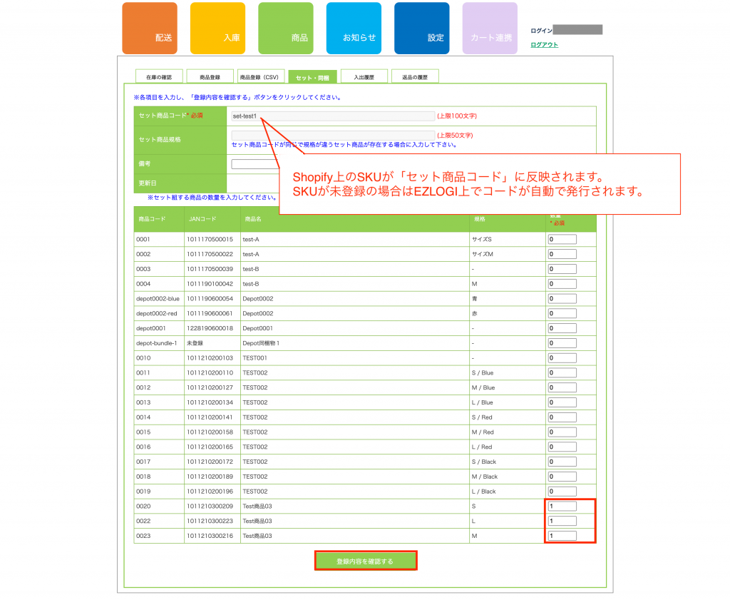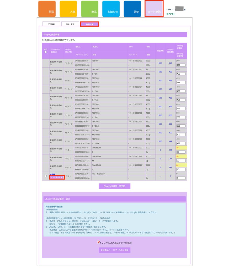 後からセット商品コードを変更したい場合は、EZLOGI上とShopify上必ず両方で変更いただくようお願いします。
