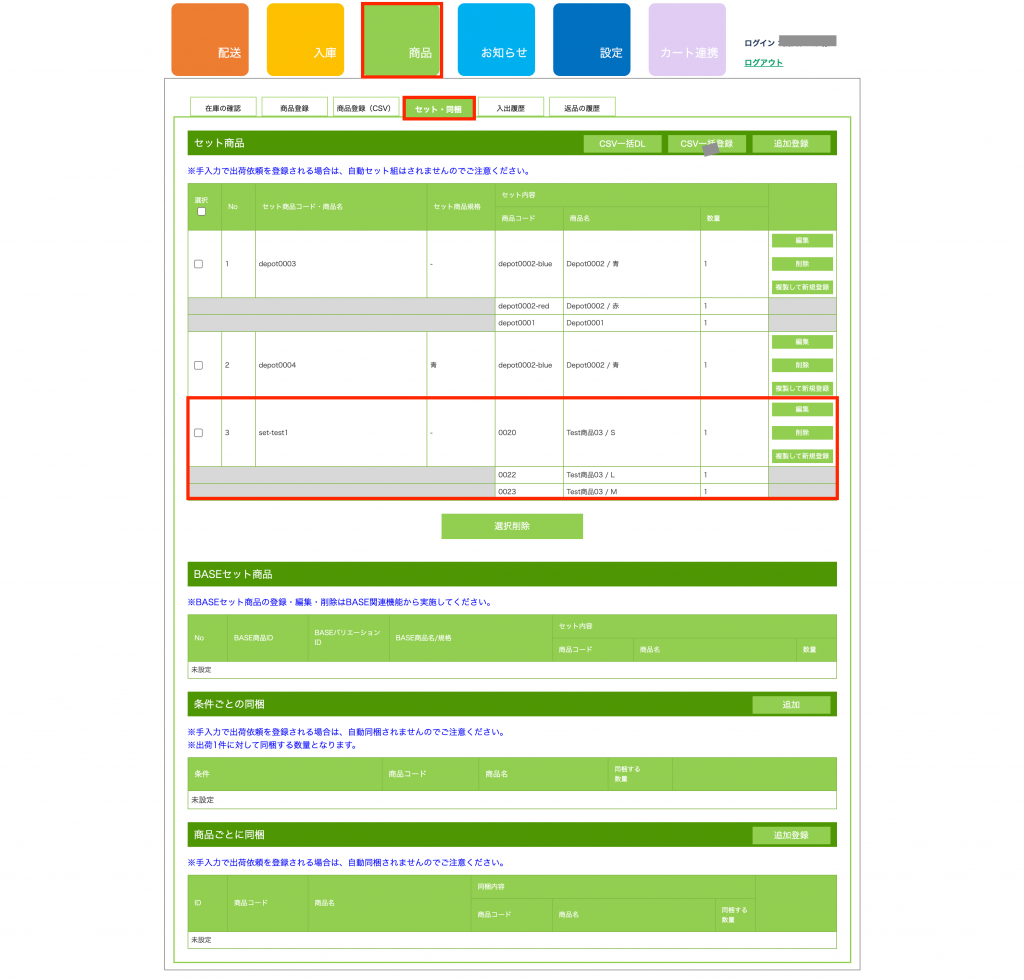 登録したセット商品は、EZLOGI上「商品」>「セット・同梱」にて確認できます。