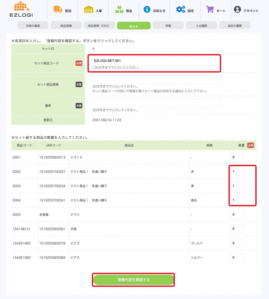 内容を確認して「セット商品情報を登録する」ボタンをクリック