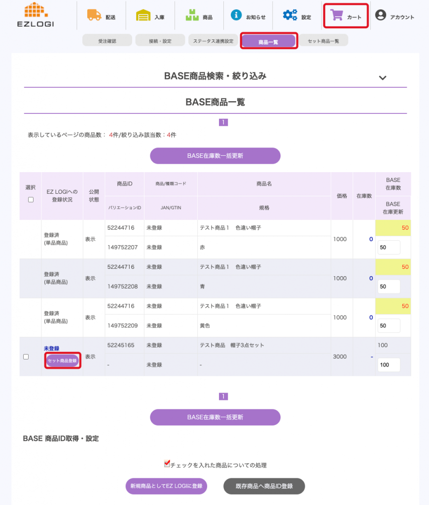 出荷の準備として、BASEに登録されている商品をEZLOGIに登録する必要があります。