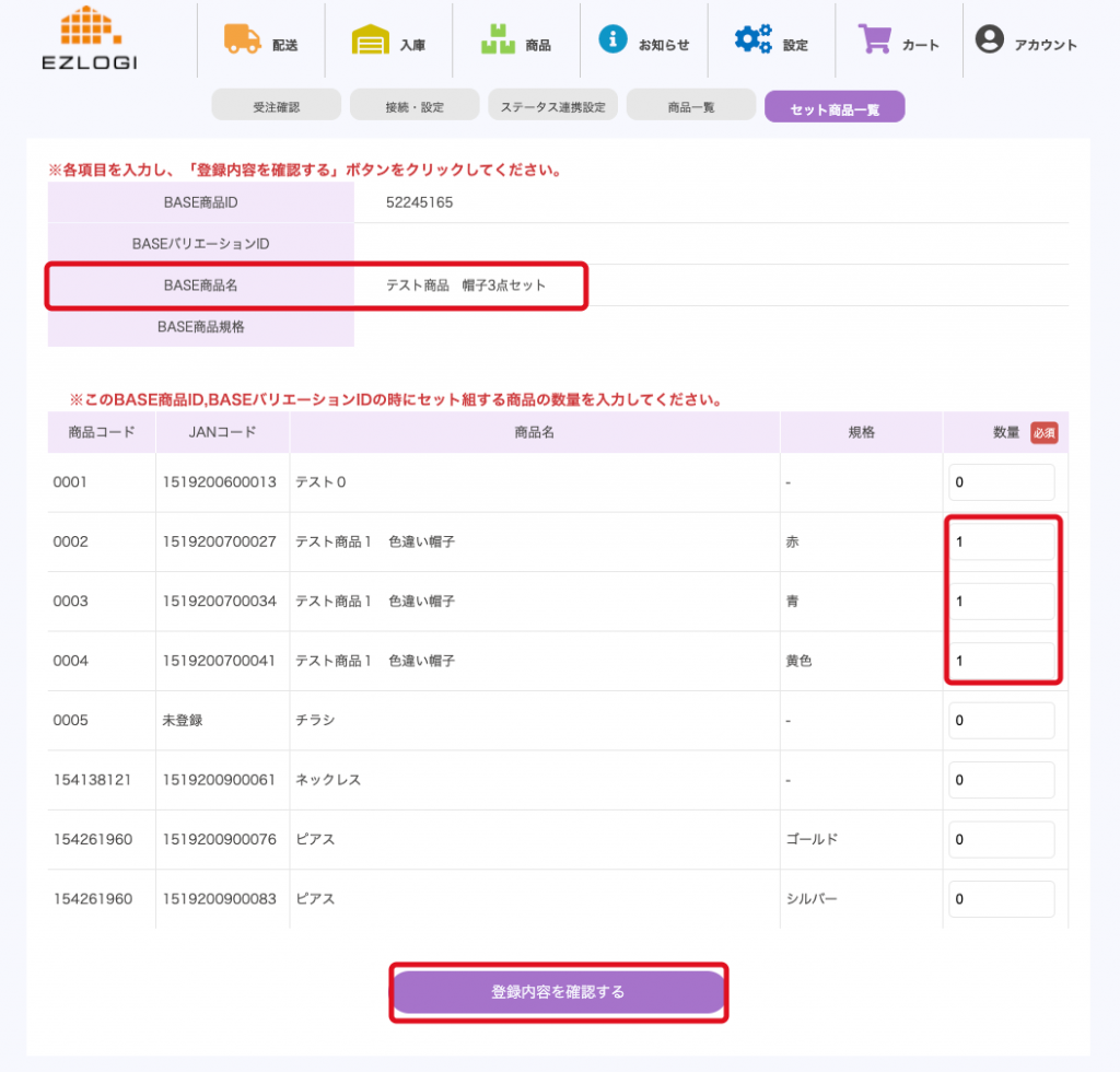 BASEに登録されている「BASE商品名」を確認後、セット商品の内容数量を入力し、「登録内容を確認する」ボタンをクリック