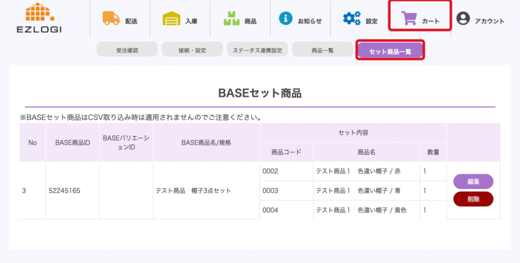 「BASE」>「セット商品一覧」からセット内容の編集・削除も可能です。