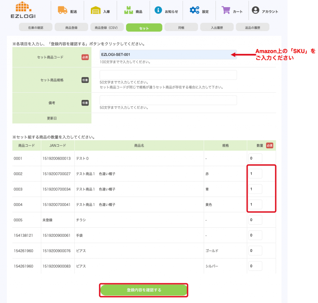 セット商品コード、セット登録する商品の数量を入力