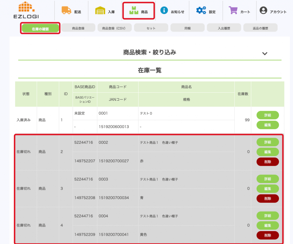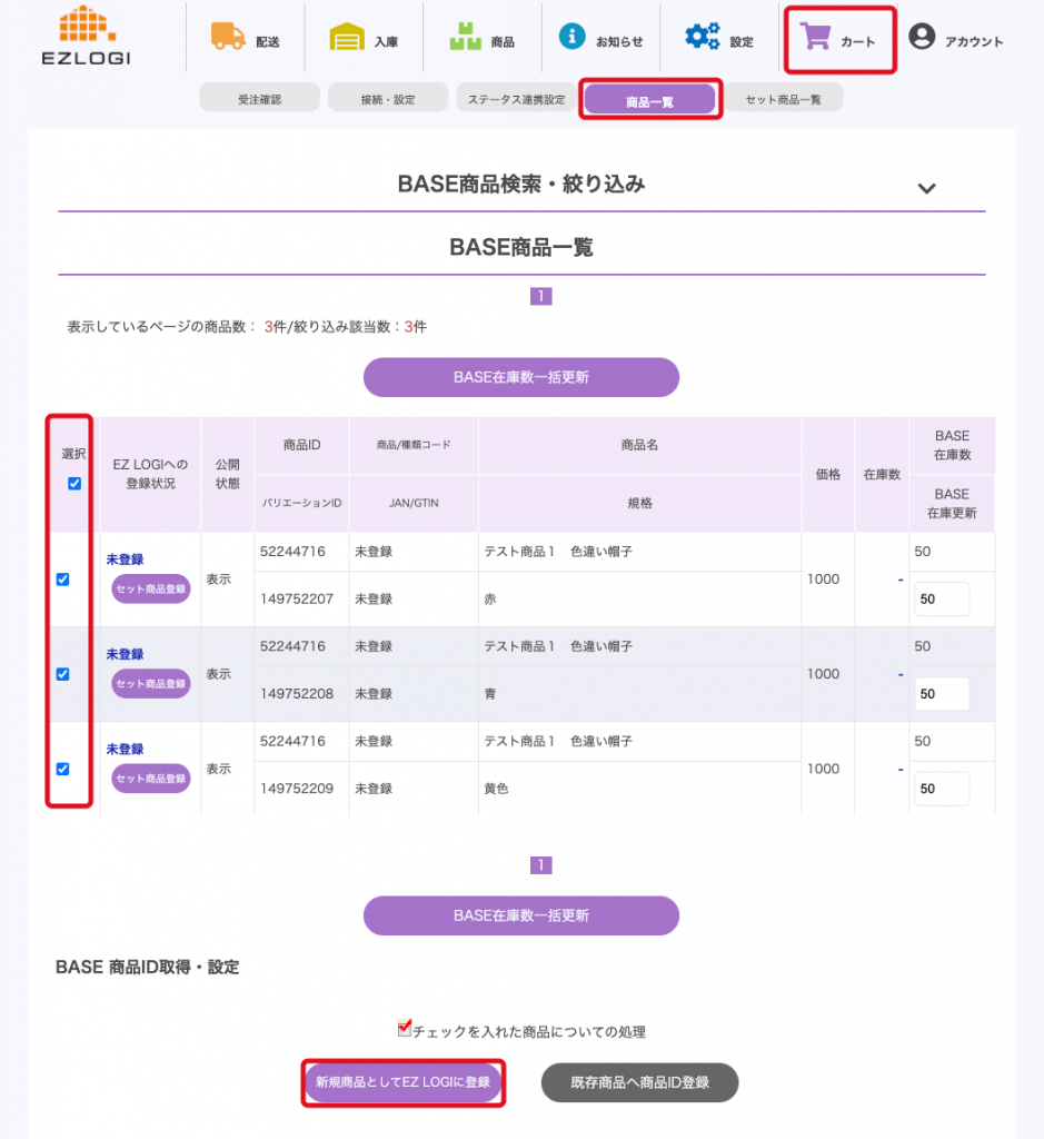 出荷の準備として、BASEに登録されている商品をEZLOGIに商品登録する必要があります。