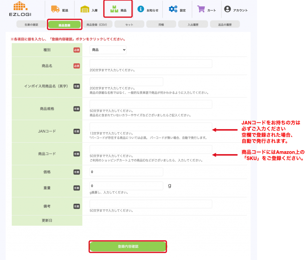 商品コードとJANコードは空白で登録した場合、自動的に発行されます。