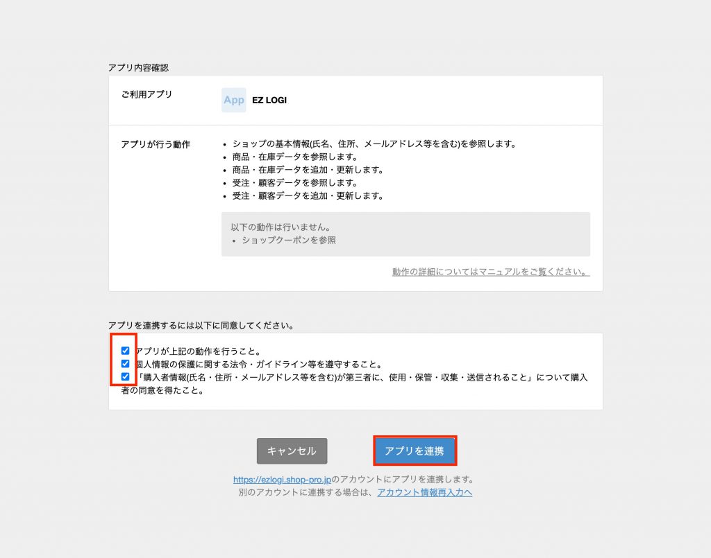 内容確認後、同意項目のチェックボックスにチェックをして、「アプリを連携」ボタンをクリック