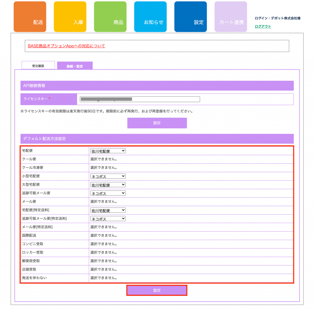 選択できる項目のプルダウンにて配送方法を選択し、画面下部の設定ボタンを押す
