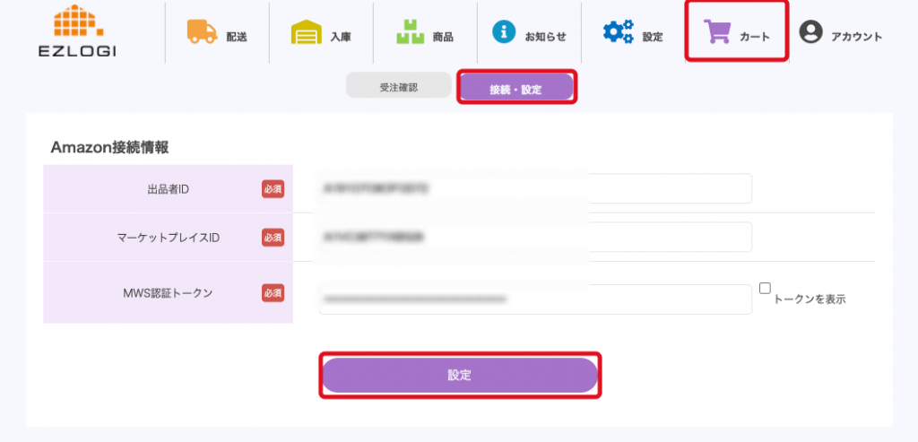 登録完了画面に表示される各内容を、EZLOGI上「カート連携」>「Amazon」をクリックして表示されるAmazon接続設定画面の同名項目に入力して、「設定」ボタンをクリック