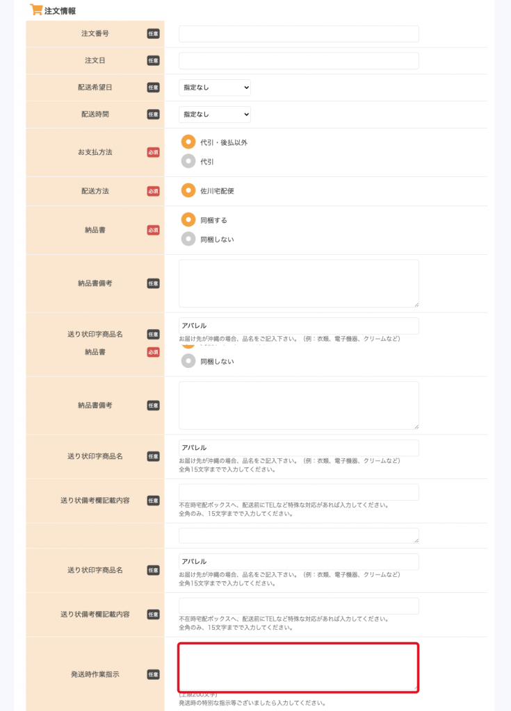 梱包に関して必要な手順などございましたら、「発送時作業指示」欄に記入してください。