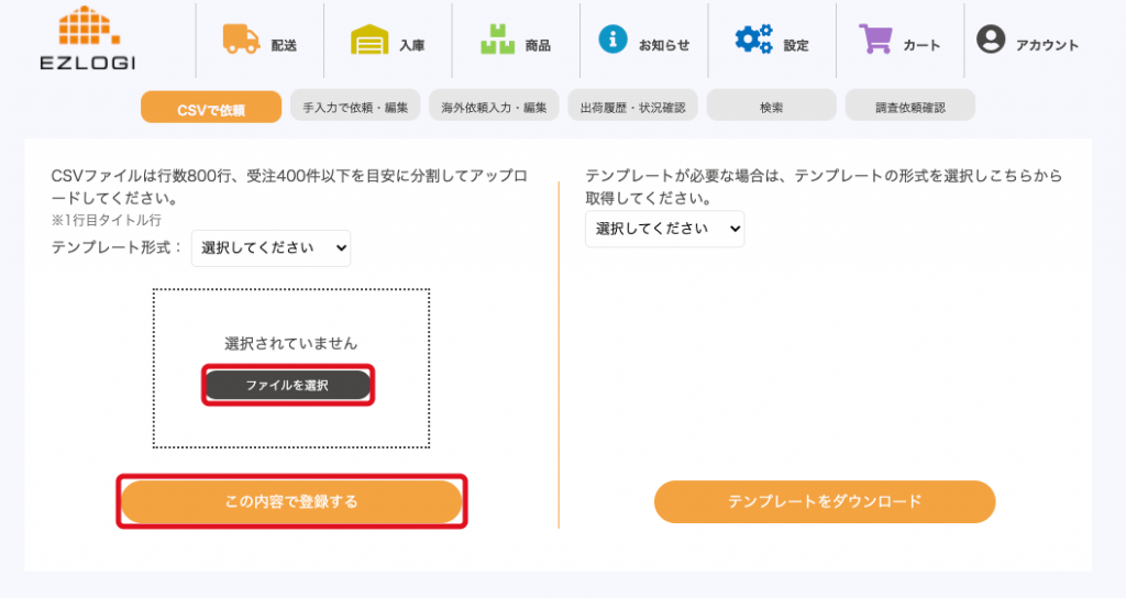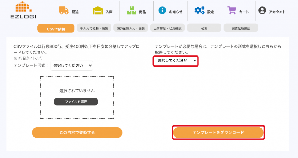「配送」>「CSVで依頼」ページから対応するテンプレート形式を選択