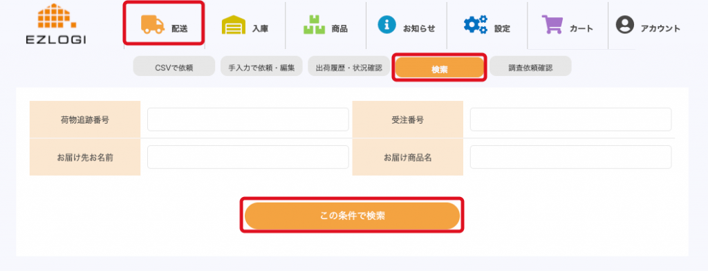 返品や、代品の出荷等で過去の出荷について知りたい場合、「配送」>「検索」 ページにて過去の出荷を検索することができます。
