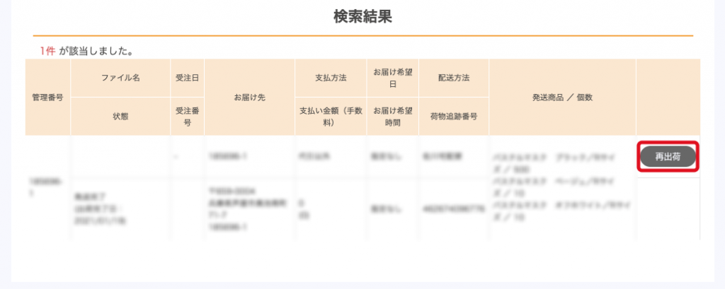 検索結果の右にある「再出荷」をクリックすると、同じ内容の出荷を再度行うことができます。