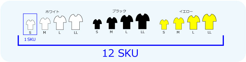 例えばTシャツで、カラーが3色あり、サイズがS・M・L・LLの4種類ある場合、「12SKU」と数えます。