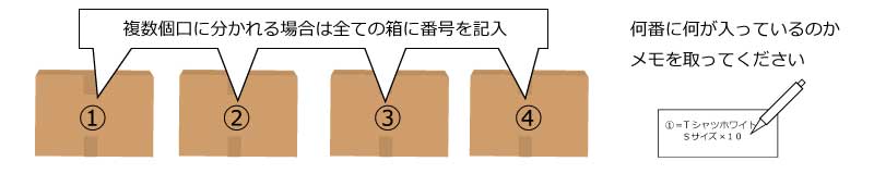 また、複数個口に分かれる場合には、全ての箱に番号を記入して、何番の箱に何が入っているのかもメモ等で保存しておいてください。