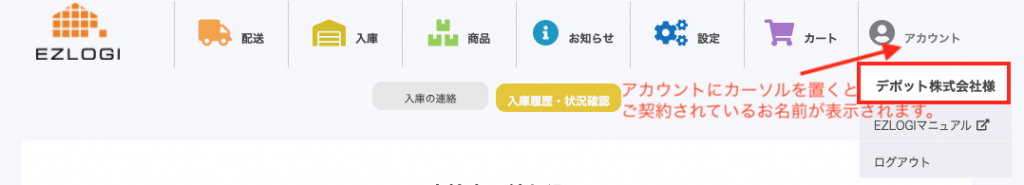 ご契約のお名前は、EZLOGI管理画面の各ページの右上部アカウントにカーソルを置くと一番上に表示されます。