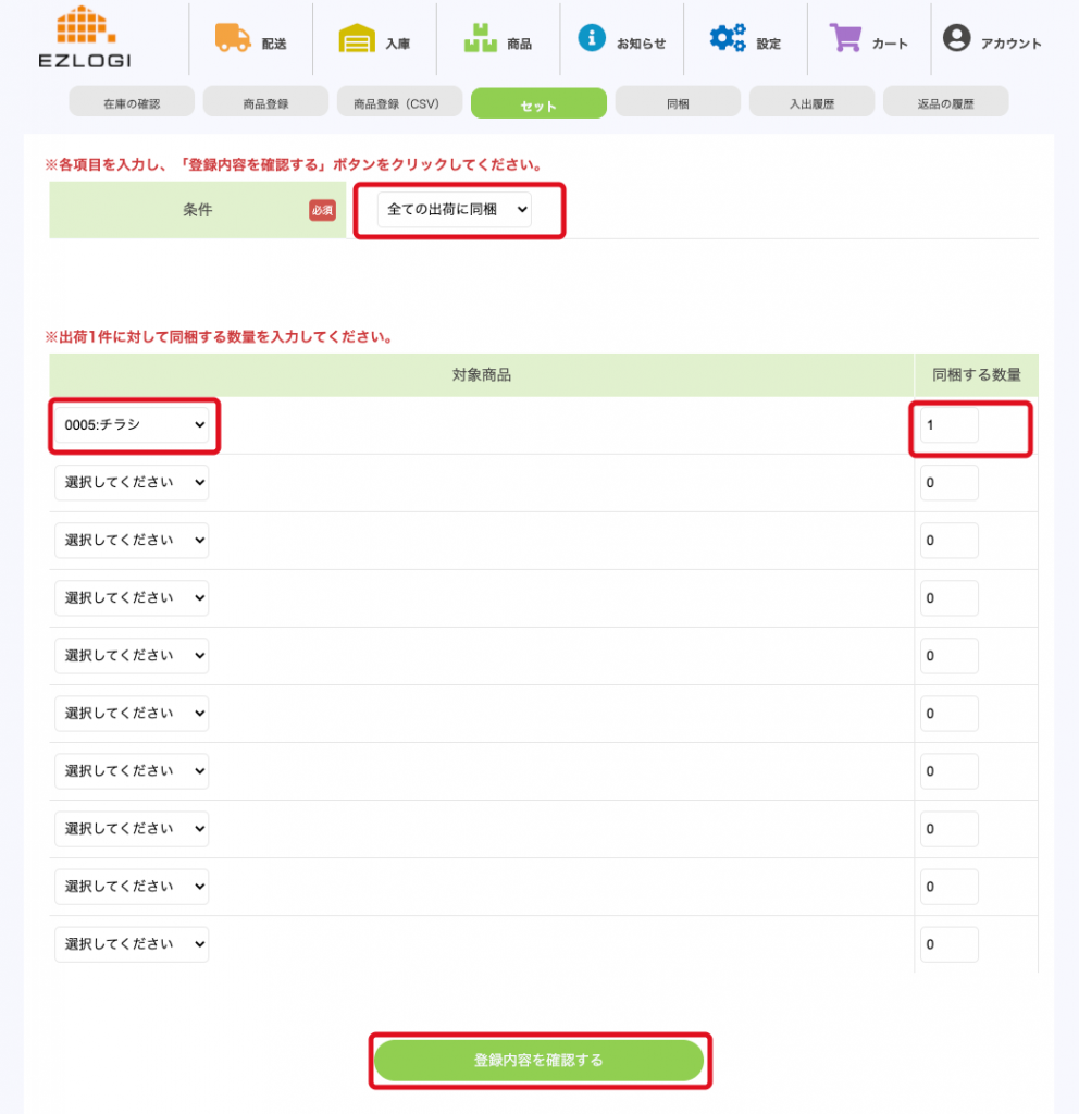 | 対象商品 | 同梱する対象の商品を選択します。 |