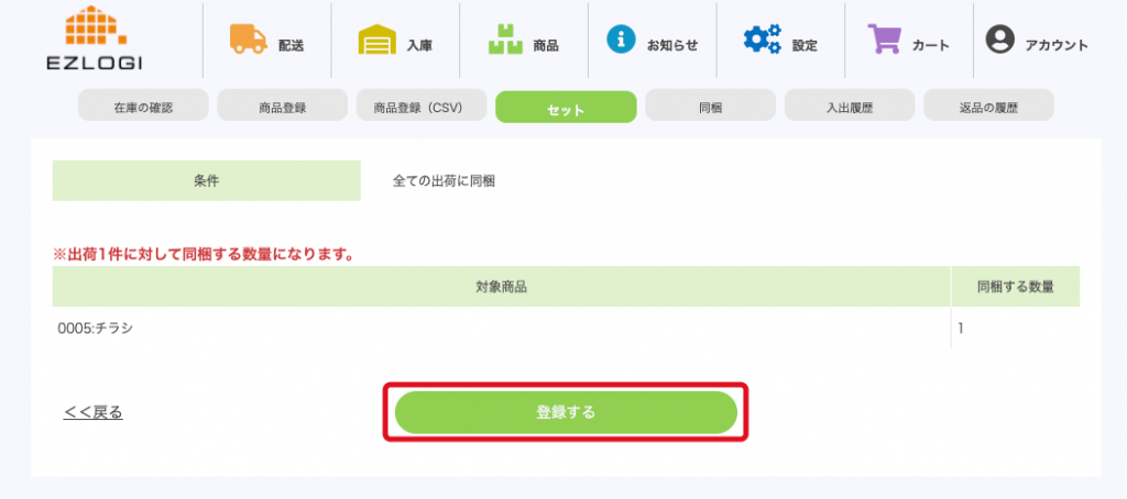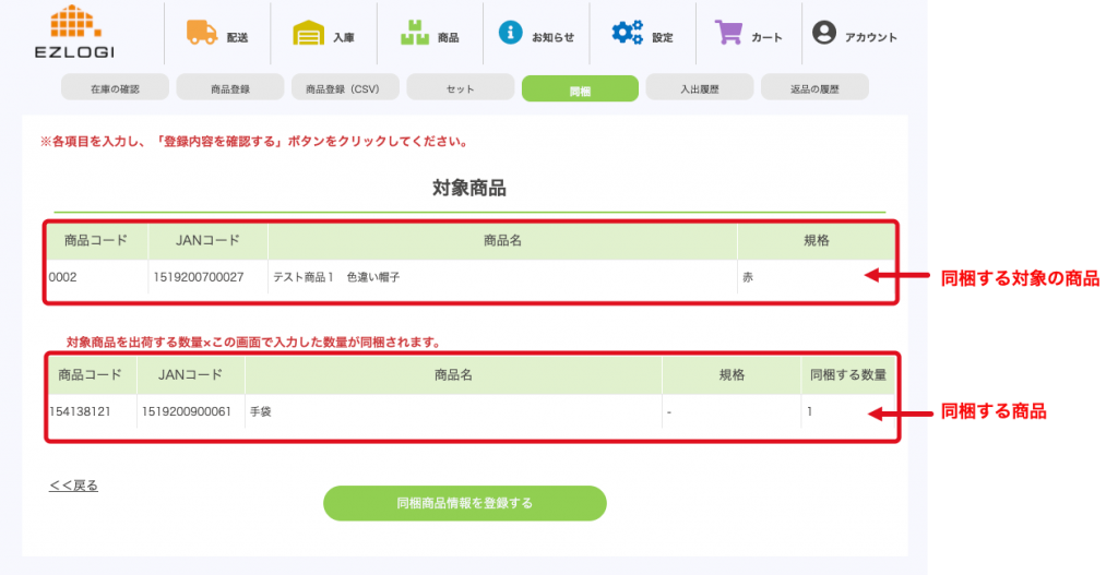 登録内容を確認の上、「同梱商品情報を登録する」ボタンをクリック