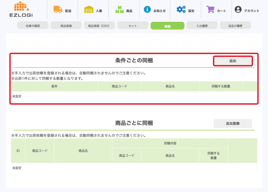 「条件ごとの同梱」のタブ右上の「追加」をクリック