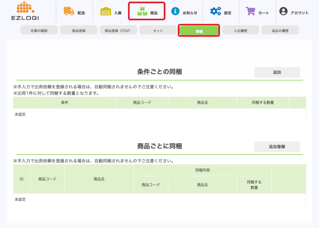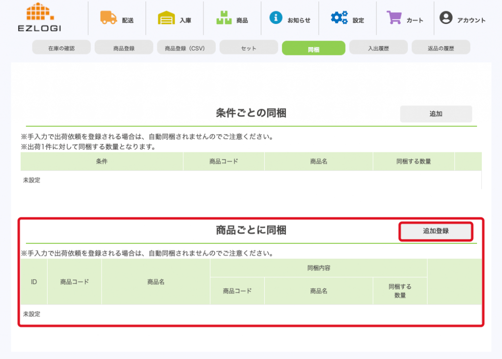 「商品ごとに同梱」のタブ右上の「追加登録」をクリック