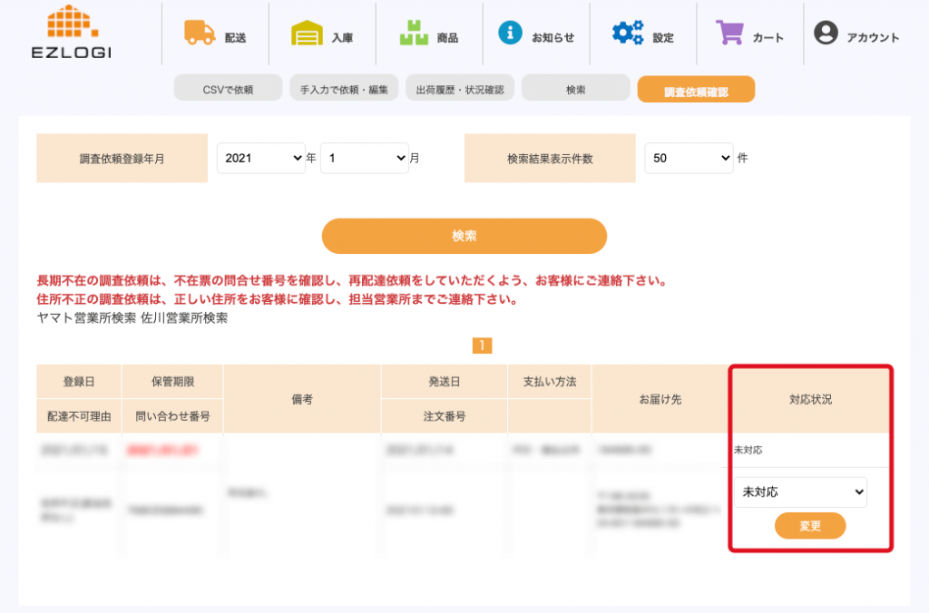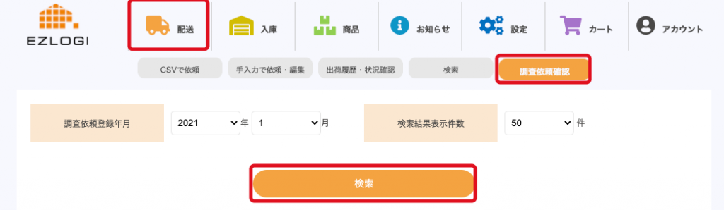 また、EZLOGI内「配送」>「調査依頼確認」ページより、確認したい月ごとに検索して内容を確認することができます。